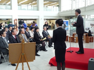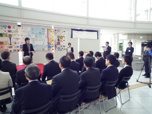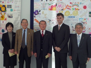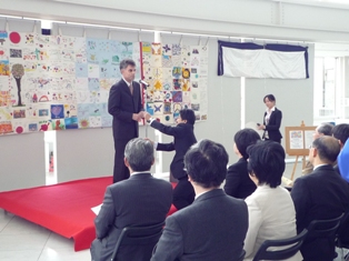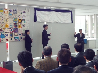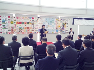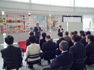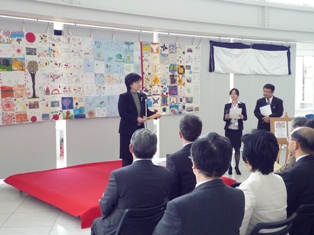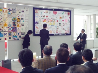 大府市役所で開催されたキルト展では、市内の大府高校二年生320人がそれぞれ描いたメッセージキルトが新たに加わりました。大府高校は、リンダ・オオハマの紹介でカナダ・ノースバンクーバー市の中高一貫学校と姉妹提携を結んでいます。 会場には大府高校の作品二枚とカナダの子どもたちの作品二枚を展示しました。 1月26日の開幕式には、久野孝保市長やマット・フレーザー在名古屋カナダ領事ら50人が参加くださいました。