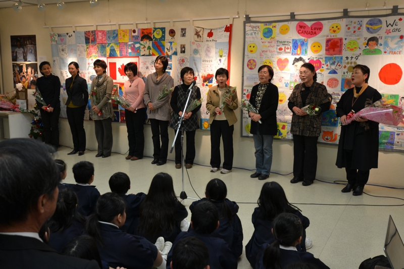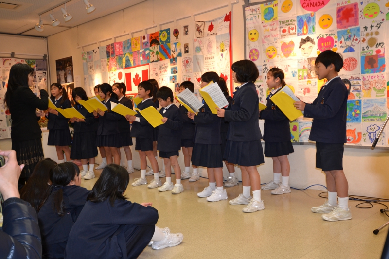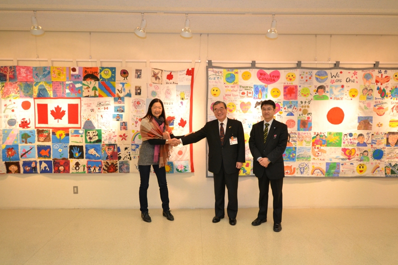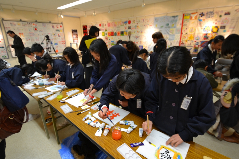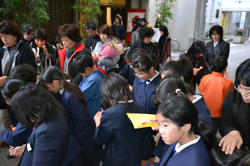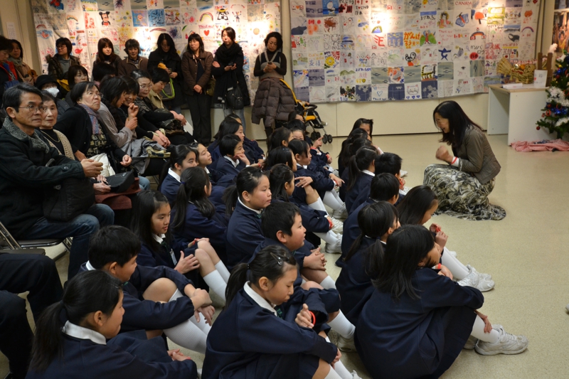 尾道でのキルト展は、このキルト展の日本全国巡回展の出発でした。 オープニングセレモニーでは、尾道市立瀬戸田小学校と尾道市立高須小学校の合唱団のみなさんがそれぞれ合唱を披露して下さいました。 また、フリードカナダ大使さんからのビデオメッセージ、福島から広島に避難してきた女性の話、オープニングセレモニーの最後には東北の復興を願ってろうそくを灯し黙祷しました。 最後に時間のある子どもたちがキルトメッセージを描いてくれました。
